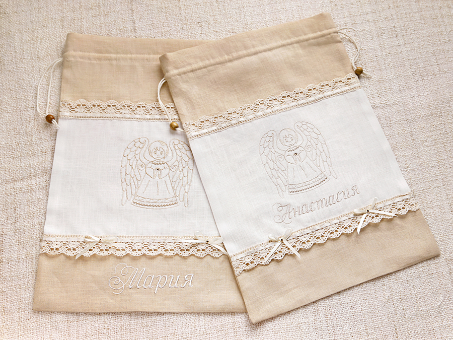 Мешочек декорирован кружевом и вышивкой ангела золотыми нитями
