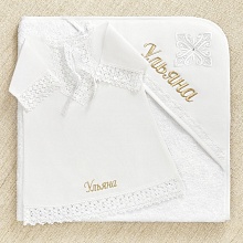 Крестильный набор для девочки, скромный и изящный. Рубашка и головной убор сшиты из мягкого хлопка, украшены хлопковым кружевом. Полотенце – пушистая хлопковая махра чисто белого цвета, именной вариант делаем за 1-2 дня. Рубашечка без вышивки, просто с красивым широким кружевом, имя или крестик вышьем дополнительно по желанию. Сорочка с рукавом по локоть, длинная до пяточек, прямая, надевается через голову. Передняя планка украшена широким кружевом, завязывается на кружевные завязки. Такое же широкое кружево украшает края рукавов и подола, благодаря чему сорочка выглядит более воздушной и легкой. Для девочек старше 3-х лет (от 104 роста) рукав у рубашки длинный по запястье и отрезной от плеча, ткань более плотная - х/б сатин. Головной убор можно выбрать: чепчик или косынку с широкой кружевной вставкой, как на сорочке. Полотенце для принятия от купели влияет на цену набора, его предлагаем в трех вариантах: • Недорогое прямоугольное полотенце с фабричным краем 70х130 см (базовая цена) • Квадратное полотенце 95х95 см с капюшоном, обработанное сатиновой бейкой – стандартный и самый популярный вариант. • Квадратное полотенце 105х105 см с капюшоном и кружевом по всем срезам– премиум-вариант. На всех трех моделях вышит крупный равносторонний крестик диаметром 14 см белыми нитями. Отдельно можно купить мешочек для хранения комплекта и выполнить на нем именную вышивку. Такое решение особенно актуально в семье с двумя и более детьми. |
