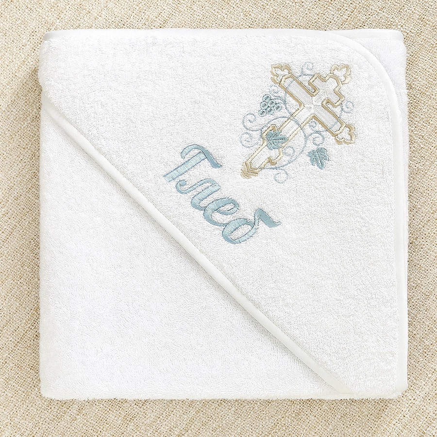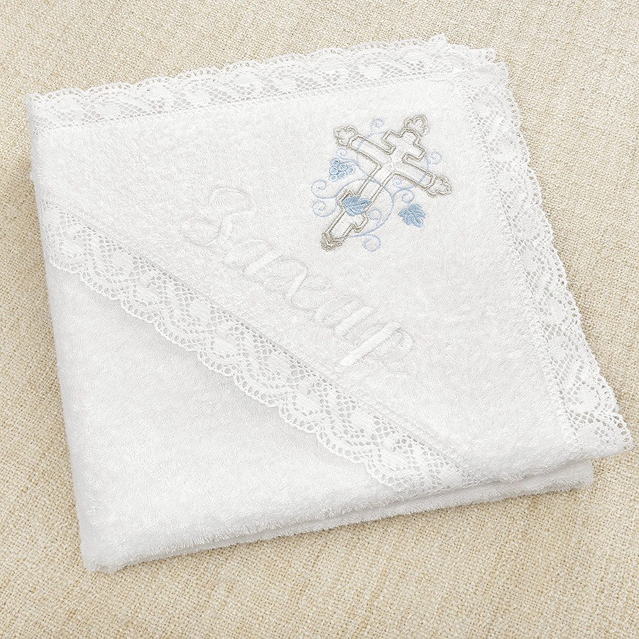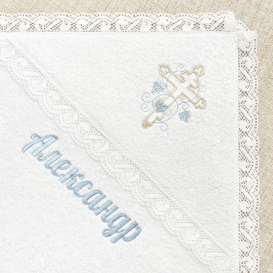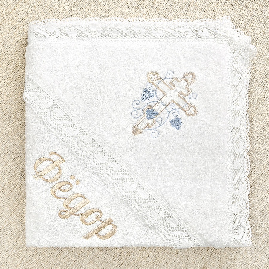 На любом полотенце вышит красивый православный крест 14 см, обвитый голубой виноградной лозой, можно дополнительно вышить имя мальчика.