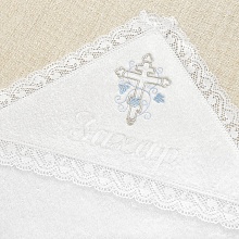 Самый красивое и дорогое – кружевное махровое полотенце 105х105 см с вышитым уголком, также на подкладке. Все края и капюшон декорированыплетеным хлопковым кружевом с нейтральным волнистым рисунком.