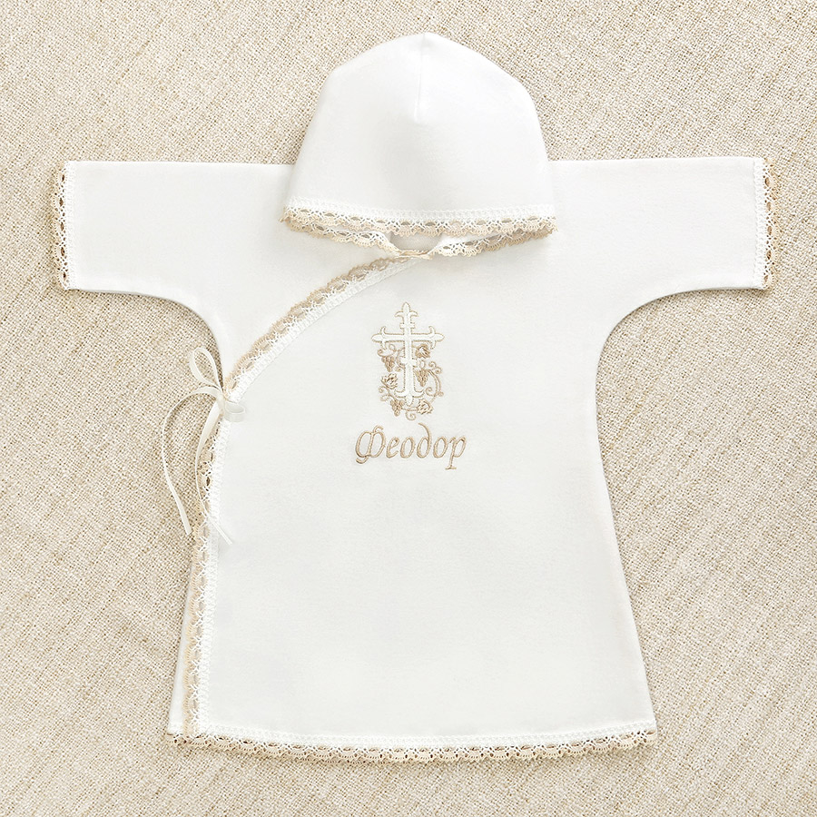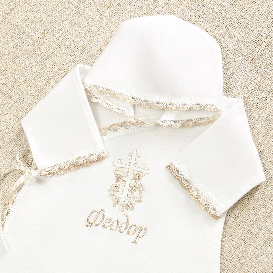 Тип рубашки – распашонка с капюшоном, завязывается на пару внутренних и наружных завязок. Спереди вышит бело-бежевый православный крестик с веткой виноградной лозы. Все края изделия обработаны кружевом.