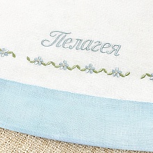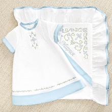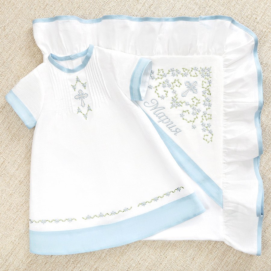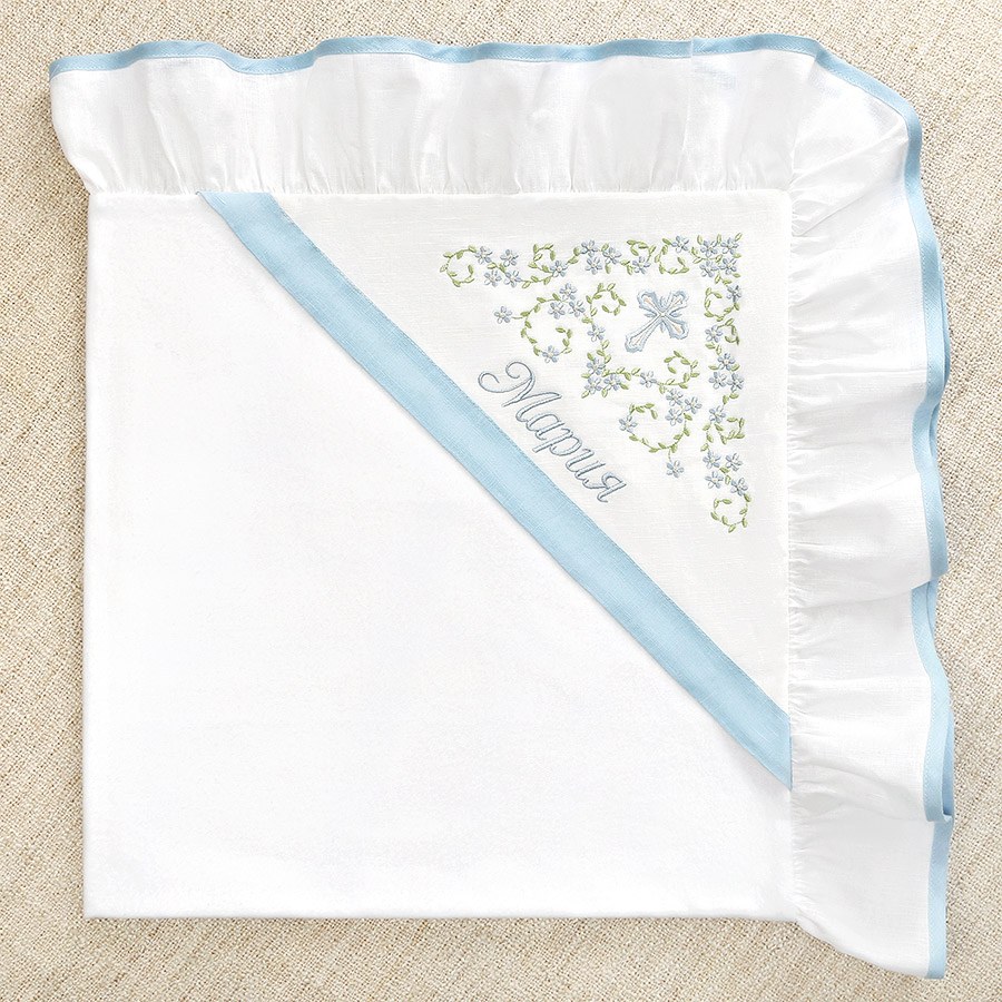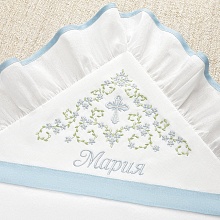Необычный крестильный набор для девочки в нежном бело-голубом оформлении. Ткань комплекта – отбеленный лен с добавлением хлопка (50/50). В состав набора входит три предмета с православной вышивкой. Кроме вышивки, изделия украшают льняные вставки небесно-голубого цвета Богородицы. Платье прямого, немного расклешенного кроя длиной до середины голени. Отделка рукавов, горловины, края подола – голубая льняная окантовка. Спереди на груди сделаны небольшие складки-защипы, по центру вышит православный крестик с незабудками, такие же цветочки вышиты вдоль линии подола. Двухслойная крыжма с бело-голубой рюшей по периметру. Верхний слой – умягченный лен, изнанка – фланель. Вышивка выполнена на лицевой стороне капюшона и не касается кожи ребенка. Головной убор – чепчик или косынка с голубой отделкой и вышивкой. |