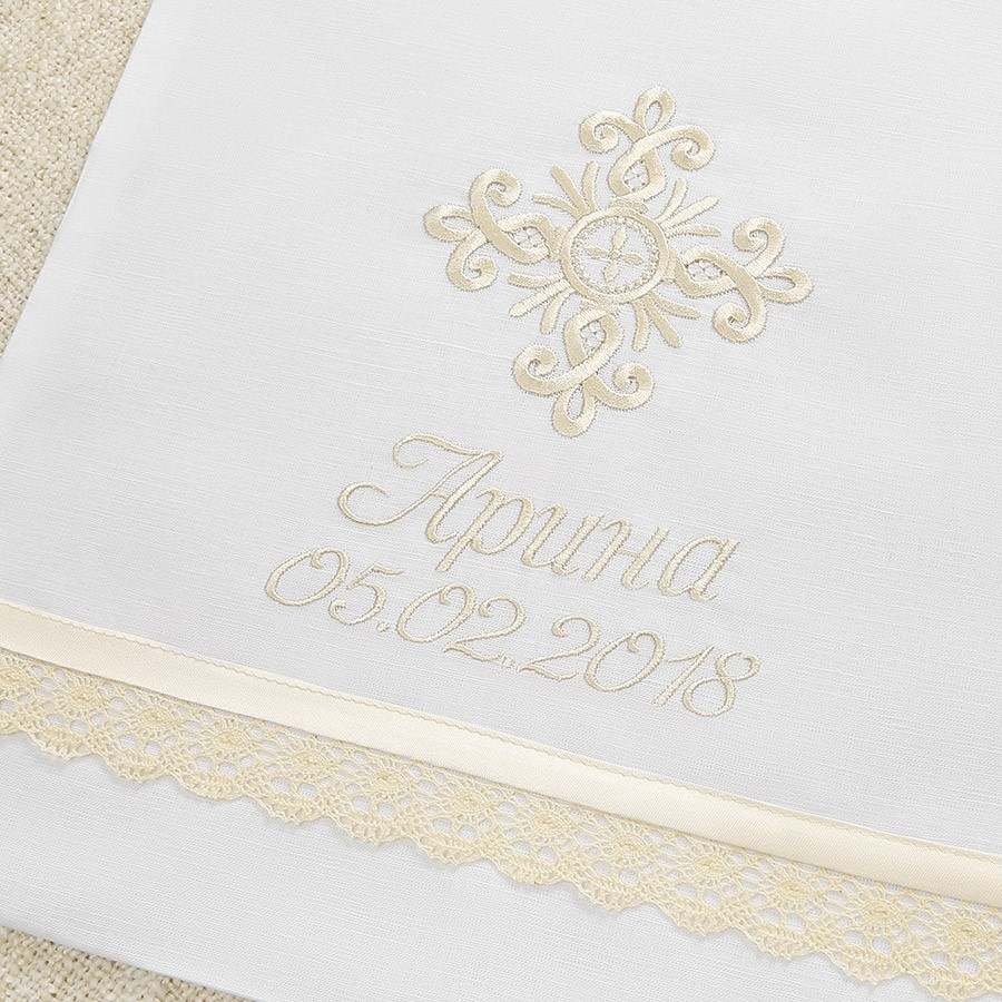 Теплый крестильный набор для девочки. Сорочка и чепчик (косынка) – фланелевые, полотенце – махровое, с плотной махрой. Вышивка и кружево мягкого бежевого цвета – уютное сочетание для крестильного комплекта. Имя Ульяна нигде не вышито, это просто название комплекта. Именную вышивку можно выполнить за 1-2 дня на сорочке и полотенце.