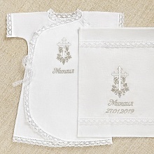 Крестильная рубашка сделана по принципу стандартной распашонки с запахом, фиксируется двумя парами завязок: внутри и снаружи. Передний запах украшает вышитый серебряный крестик с веткой винограда. С изнанки вышивку закрывает хлопковая подкладка. Все края распашонки декорированы плетеным кружевом. Именная вышивка на распашонке не выполняется из-за подкладки.