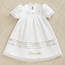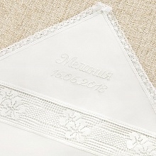 Нарядный набор для Крещения девочки из хлопка-сатина и хлопкового кружева, украшенный вышивкой. В него входит длинное пышное платье, пеленка и головной убор. Имя Ксения нигде не вышито, это просто название комплекта. Именную вышивку можно заказать отдельно. Срок исполнения – 1-2 дня. Платье в складку, с коротким рукавом-фонариком и завышенной талией, надевается через голову, завязки на спинке. На кокетке вышит маленький крестик, вплетенный в растительный орнамент, изнанка закрыта подкладкой. Края рукавов и подола украшены тонким кружевом, на подоле вставка из кружева-прошвы. Крестильная пеленка с капюшоном без вышивки, украшенным полоской кружева на просвет с узором, как на платье. По периметру изделие оторочено краевым волнистым кружевом. Такое сочетание добавляет пеленке легкости и воздушности. Головной убор можно выбрать: чепчик или косынка со вставками из кружева-прошвы, как на платье и пеленке. |
