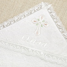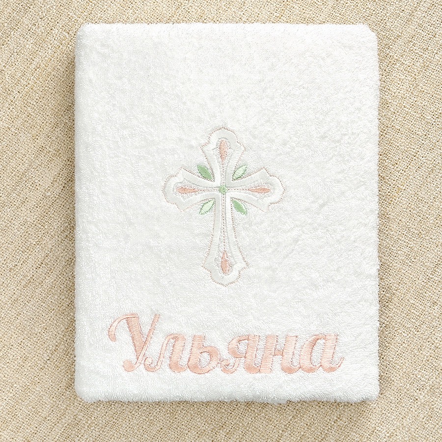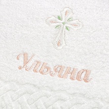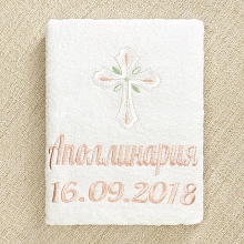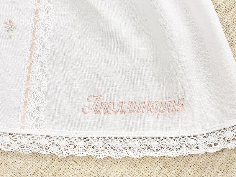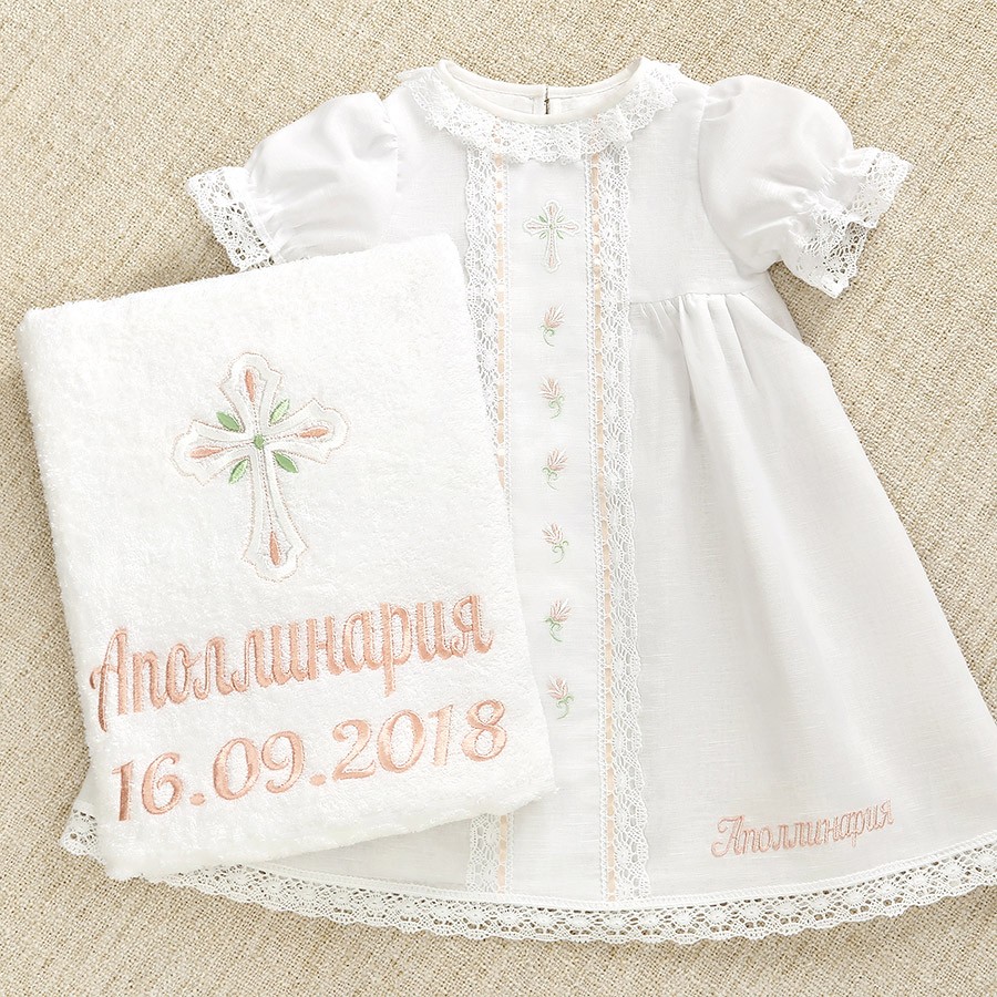 Красивый крестильный набор для девочки с нежным оформлением в пастельной гамме. Состоит из отрезного по талии льняного платья с кружевной отделкой, головного убора и махрового полотенца. Цветная вышивка и тонкая атласная лента светло-розового цвета в оформлении делают комплект особенно милым. Имя девочки можно вышить дополнительно на платье, полотенце и мешочке. Платье с завышенной талией и рукавчиками-фонариками, надевается через голову, завязывается на спинке, по всем краям оторочено тонким хлопковым кружевом. Вышивка в виде россыпи цветочков и крестик выполнены белыми светло-розовыми и светло-салатовыми шелковистыми ниточками. Головной убор можно выбрать. Либо чепчик на завязках, либо косынку с вышитыми цветочками, как на платье. Полотенцем-крыжмой с крестиком как на платье набор также комплектуется на выбор:
