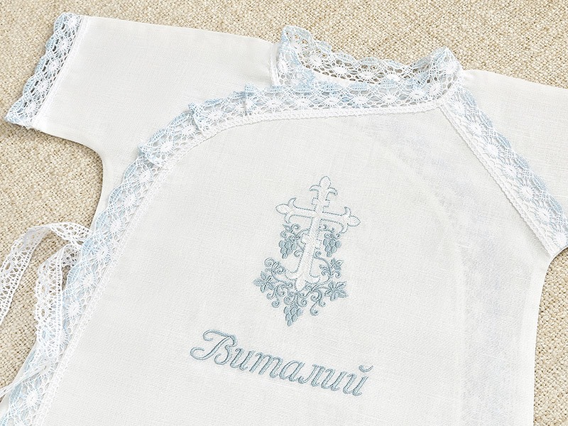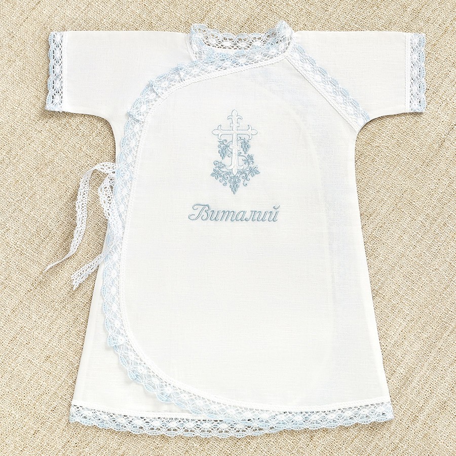 Рубашечка длинная, полностью распашная спереди, внутри и снаружи 2 пары завязок, на переднем запахе вышит белый крестик с голубой лозой. Все края обработаны бело-голубым краевым кружевом. Рубашка не маломерит, можно смело брать размер в размер, более подробный параметры приведены в таблице размеров.
