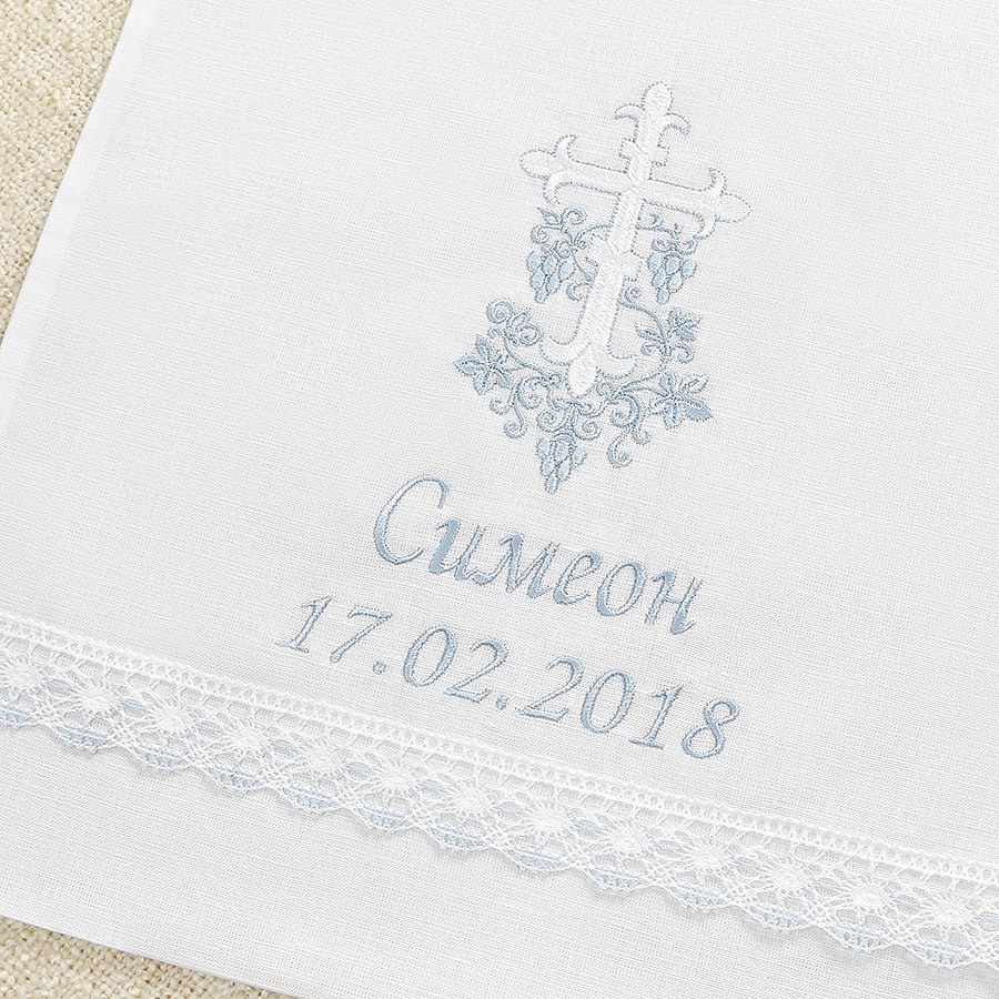 Третий предмет также идет на выбор: чепчик с голубой вышивкой и бело-голубым кружевом или льняной мешочек с вышитым крестиком. Мальчикам не всегда надевают головной убор, поэтому у нас предусмотрен вариант комплектации с мешочком для хранения набора после Крещения. На мешочке можно вышить имя ребенка и дату Таинства, что особенно уместно в семье, где есть другие дети. Отметьте свой выбор при заказе или напишите в комментариях к корзине.