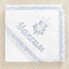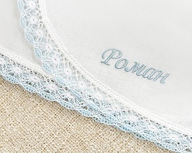 Нежный крестильный набор для мальчика с голубой вышивкой и бело-голубым кружевом. Рубашка сшита из отбеленного умягченного льна, полотенце – пушистая хлопковая махра. Именную вышивку можно заказать на рубашке, полотенце и мешочке.