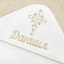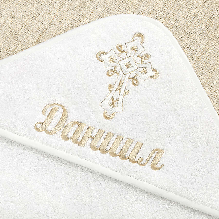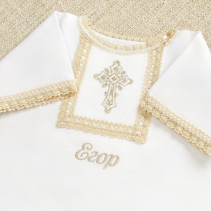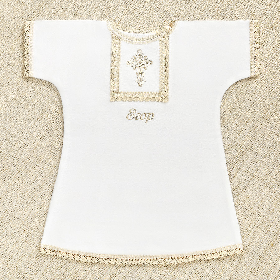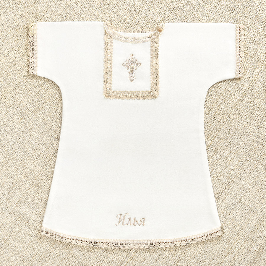 Крестильный набор для Крещения в холодное время года. Рубашка сшита из мягкой ткани с начесом. Полотенце – плотная хлопковая махра. Имя и дату Крещения можно вышить на обоих предметах комплекта. Срок исполнения – 1-2 дня. Рубашка длинная, свободная, надевается через голову. Застежка – пуговица, планка распахивается для Миропомазания. На груди вышит бежево-белый крестик. Отделка краев выполнена бежевым плетеным кружевом. В крестильное полотенце ребенка принимают от купели, его модель можно выбрать. Цена набора в каждом случае будет разной: