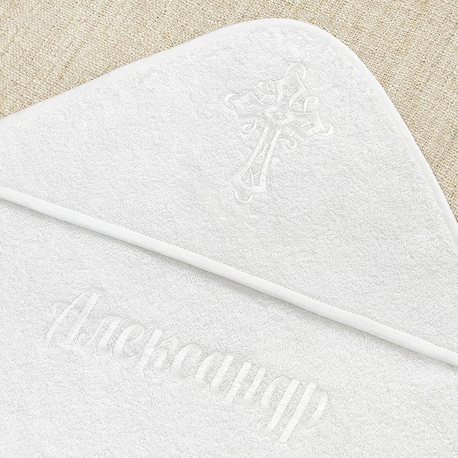 На обоих изделиях вышит такой же крест, как на распашонке. Выбранная модель полотенца напрямую влияет на цену набора.
