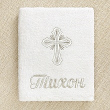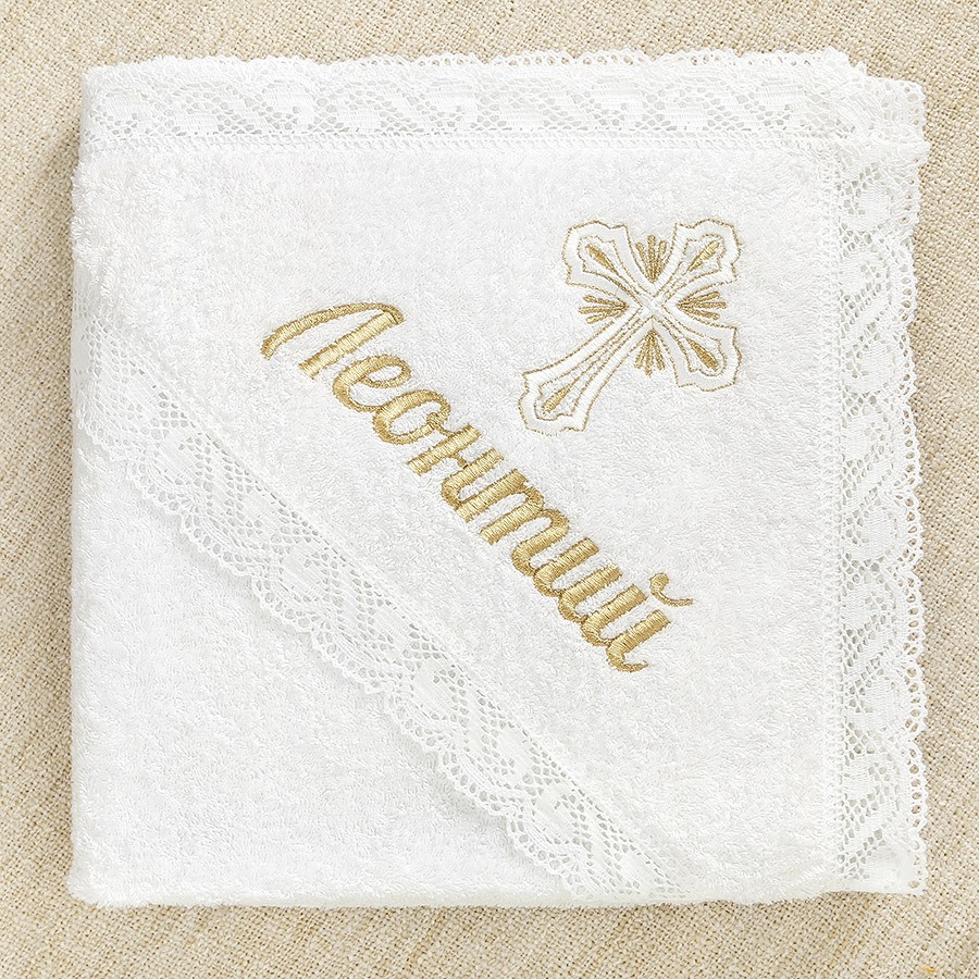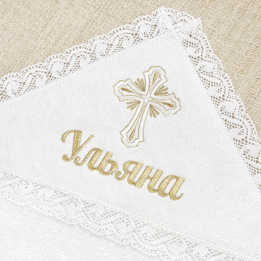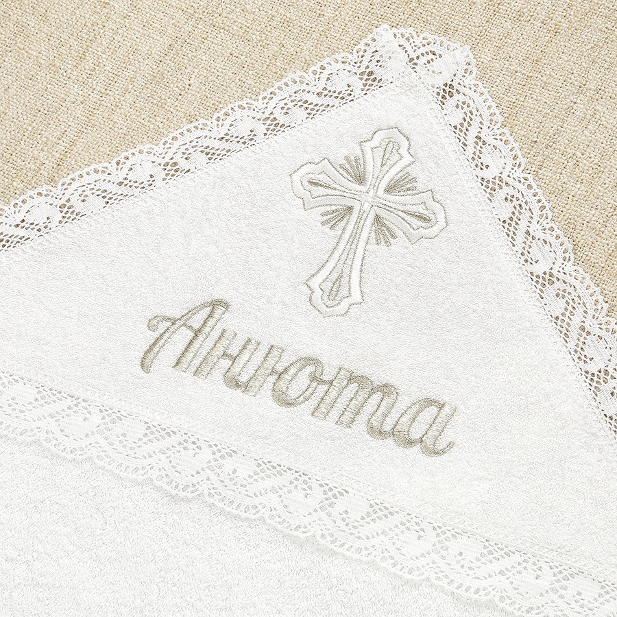 Набор с рубашкой из тонкой или теплой ткани и махровым полотенцем. На лето рекомендуем выбрать рубашку из перкали, а фланель - отличный вариант для Крещения ребенка в холодный сезон. Выбранную ткань укажите в комментариях к заказу. В наличии также два вида оформления: в золоте и серебре. Благодаря нейтральным цветовой гамме и узору кружева на рубашке комплект подойдет для Крещения мальчика и девочки. Именную вышивку мы делаем за 1-2 дня на рубашке, полотенце или мешочке из набора. Рубашка прямая, длинная по щиколотку, на спинке полностью распашная, застегивается на кнопки. Вырез, края рукавов и подола украшены кружевом. На груди вышит крестик. Полотенце для принятия от купели влияет на цену набора. Его можно выбрать из трех вариантов (стоимость по возрастанию):