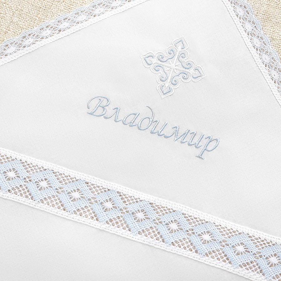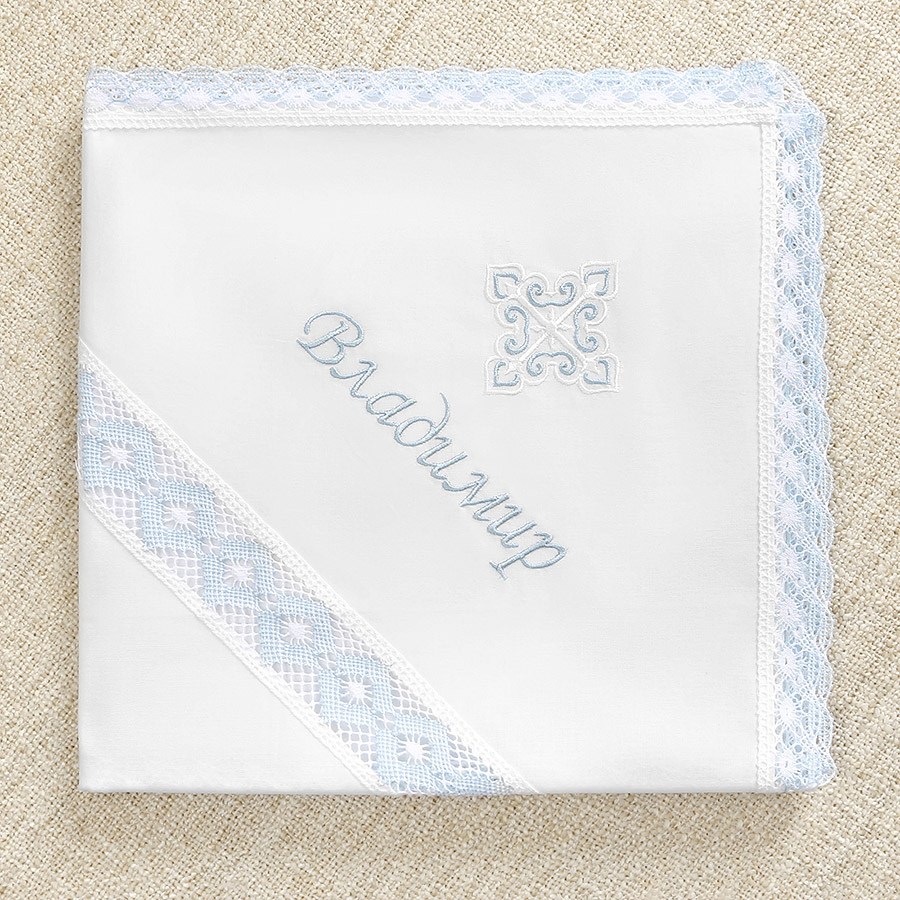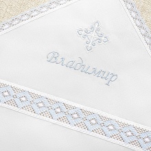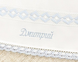 По периметру изделие декорировано краевым волнистым кружевом. Такое сочетание добавляет пеленке легкости и воздушности. Именная вышивка делается либо в уголке, либо на капюшоне. Мальчикам до года на Крещение разрешено надевать головной убор, поэтому в комплект входит либо чепчик с кружевной вставкой, либо мешочек для хранения набора. На мешочке можно вышить имя малыша. |