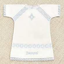 Красивый ажурный набор из мягкого тонкого хлопка, украшен широкими кружевными вставками и краевым кружевом бело-голубого цвета. На изделиях комплекта нигде не вышито имя Александр, это просто торговое название. Имя мальчика можно вышить любое: на рубашке и пеленке. Рубашка длинная, прямая, надевается через голову. Разрез и завязки – на спинке, спереди вышит крестик. Рубашка в меру свободная, соответствует росту ребенка, длина будет по щиколотку. Квадратная крестильная пеленка в наборе идет на выбор: