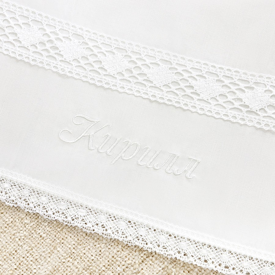 Белоснежный набор для крещения мальчика из тонкого хлопка-муслина, украшен краевым кружевом и широкими вставками из кружева-прошвы, без вышивки. Смотрится очень нежно и одновременно нарядно. По желанию на рубашке, пеленке или мешочке можно вышить имя крещаемого. Рубашка с коротким рукавом, традиционного прямого кроя, надевается через голову, передняя кружевная планка распахивается для помазания Святым Миром. Подол украшает широкая полоска кружева не на просвет. Пеленку в наборе можно выбрать из двух видов: с капюшоном, на котором также есть вставки из широкого кружева-прошвы или, по умолчанию, стандартная - с кружевной вставочкой в одном из углов. Размер одинаковый - 90х90 см, на любом из вариантов можем дополнительно вышить крестик. Пеленка с капюшоном хорошо подойдет для Крещения новорожденного, а обычная - для мальчиков постарше. Все срезы простынки декорированы волнистым краевым кружевом. Третий предмет в комплект кладем на выбор: кружевной чепчик или мешочек с кружевной вставкой для хранения крестильной одежды. Мальчикам до года надевать головной убор не возбраняется. |