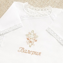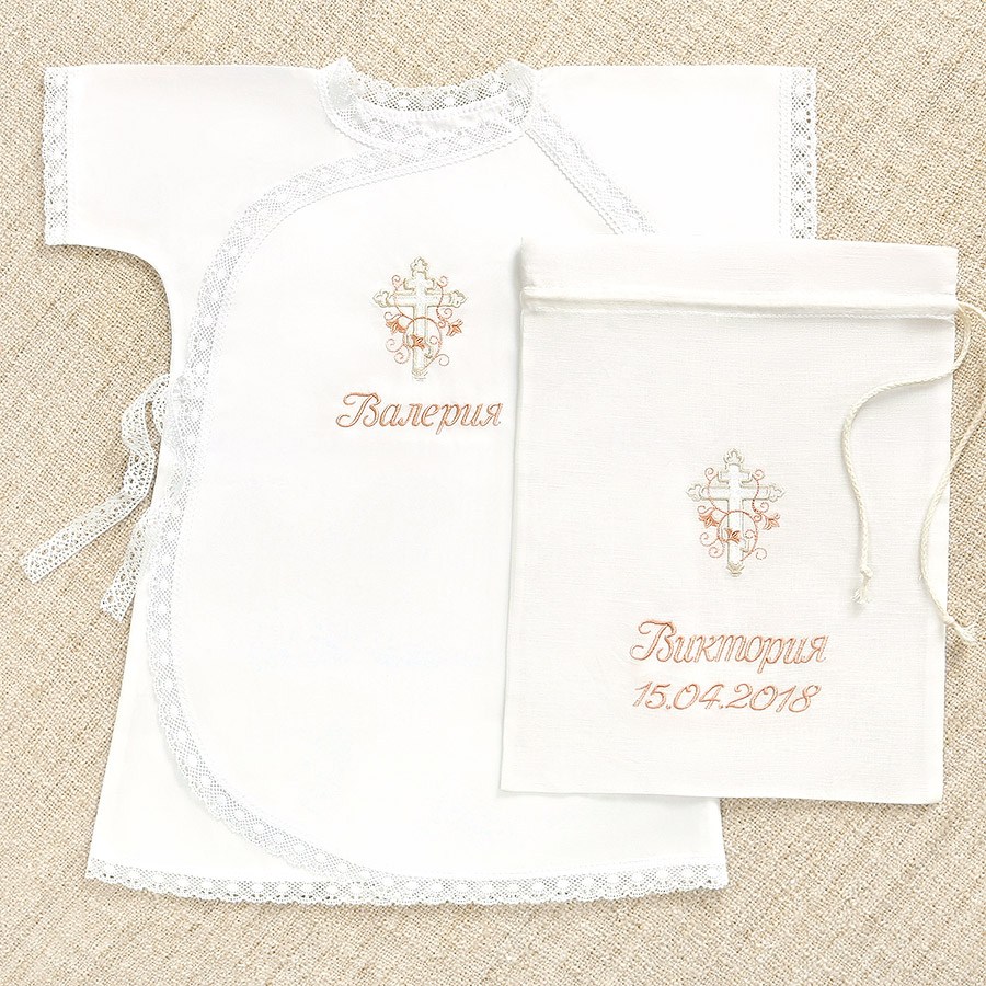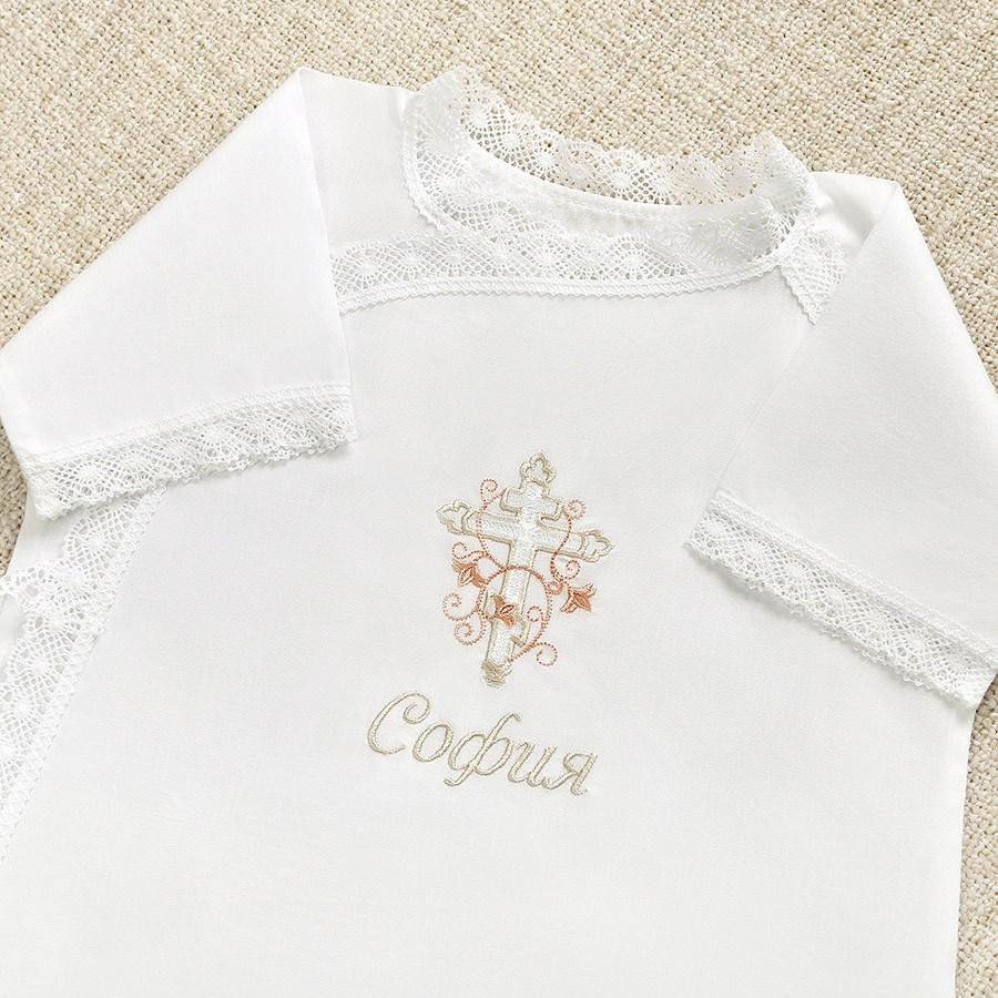 Модель полностью распашная спереди, фиксируется по типу халата-кимоно на две пары кружевных завязок. На груди вышит православный восьмиконечный крестик, обвитый цветами лилии. Вышивка выполнена в нежной пастельной гамме – сочетание белого, бежевого и теплого розового цветов.