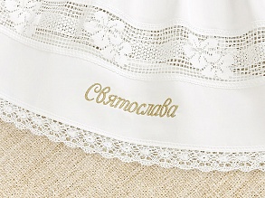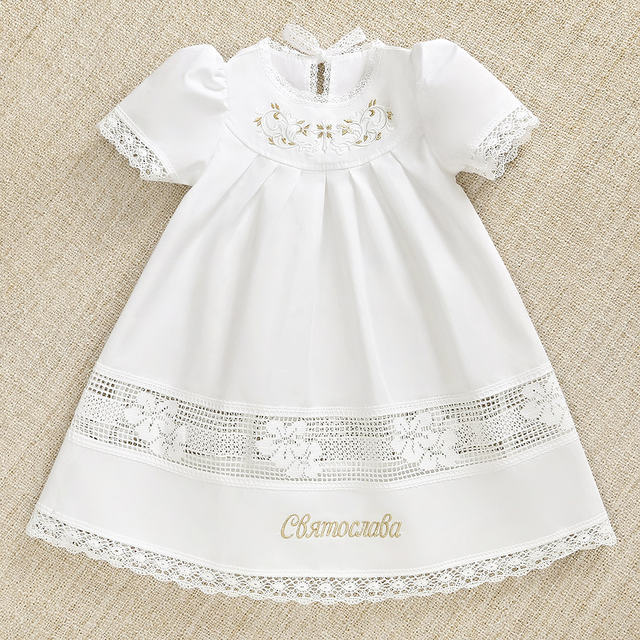 Нарядное крестильное платье с вышитой кокеткой и кружевной отделкой. На рост 62-92 см выпускается из хлопкового сатина, размеры 104-128 отшиваются из умягченного льна. Платье с завышенной талией, рукавами-фонариками, пышной юбкой с широкой кружевной вставкой. Надевается через голову, завязки расположены сзади. Края рукавов и юбки обработаны тонким кружевом. Кокетку украшает православный орнамент, в центре которого расположен миниатюрный крестик. Цветовая гамма вышивки на выбор: бело-золотая или бело-серебряная. Кокетка на подкладке, что исключает соприкосновение металлизированной нити с нежной детской кожей. Длина платья по щиколотку в размерах 62-92 см и до середины голени на рост 104-128 см. |