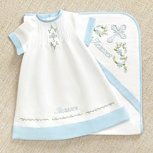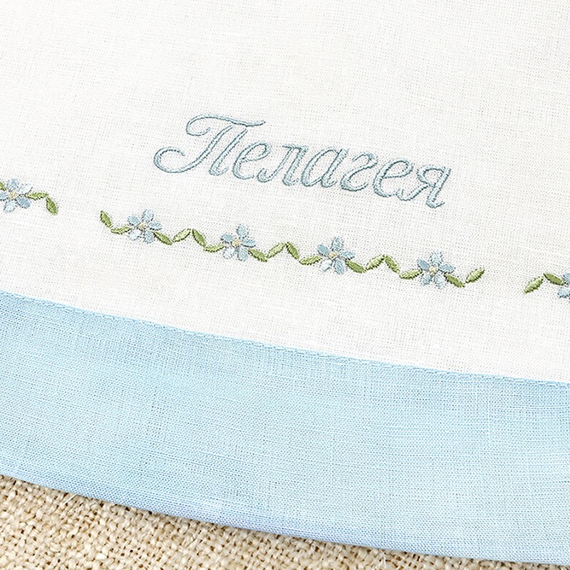 Белое льняное платье с отделкой горловины, краев рукавов и подола голубым льном. Украшено нежной православной вышивкой в сочетании: белый+голубой+салатовый+бежевый. Платье полностью распашное по спинке, застегивается на пуговицы. Длина по щиколотку. Голубые детали имеют небесный цвет Богородицы. На груди вышит православный крестик в окружении цветов незабудок. Платье выпускается в размерах от 0 до 4 лет. |