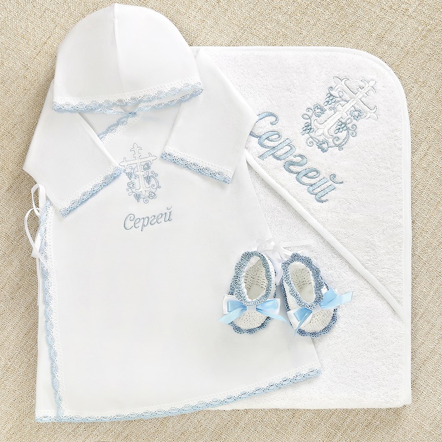 Спереди на распашонке в бело-голубой гамме вышит восьмиконечный православный крест, обвитый веткой винограда. Все срезы изделия декорированы плетеным бело-голубым кружевом под цвет вышивки.