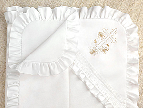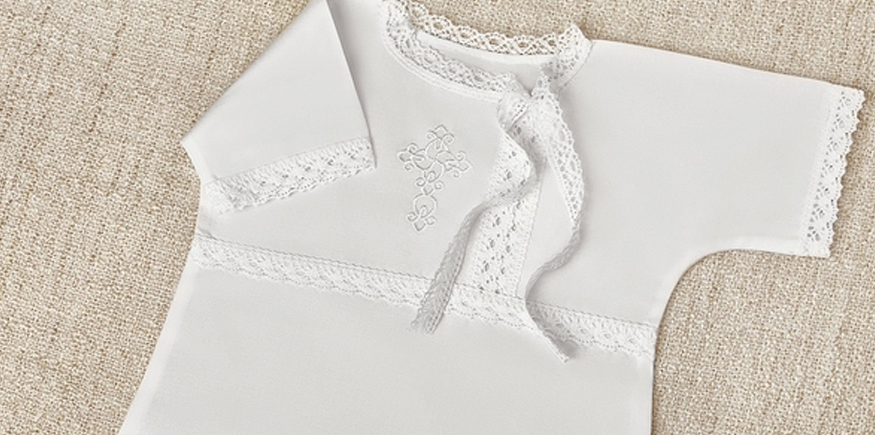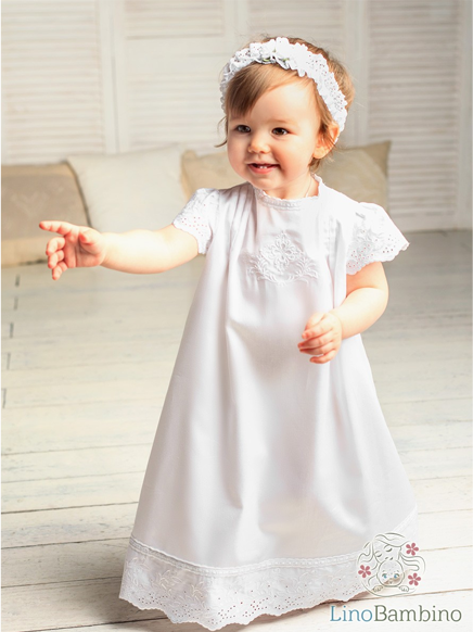 Воздушная кружевная рубашечка из шелковистого тенселя (вискоза) в комплекте с панталончиками. Цветок-брошка, собранный из кружева, ленточек, розочек и бусин украшает горловину сорочки, небольшой кружевной цветок есть и на штанишках. Сорочка имеет короткий рукав фонарик, легкую сборку по горловине, надевается через голову, разрез и завязочки находятся сзади. Длина сорочки по колено, поэтому в комплект к ней идут длинные или короткие (на выбор) кружевные штанишки с поясом на резинке. |