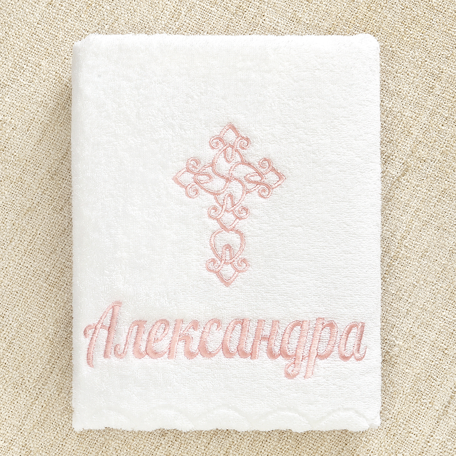 Крестильное полотенце из пушистой махры с бордюром-косичкой и фабричным краем. Размер на выбор: 70х130 или 100х150. Вышивка: ажурный православный крестик. Цвет также на выбор.