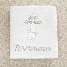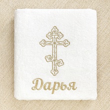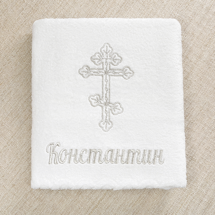 Крестильное полотенце из пушистой махры с ненавязчивым бордюром и подогнутым фабричным краем. Вышивка выполнена золотистыми или серебристыми (на выбор) вискозными нитями.