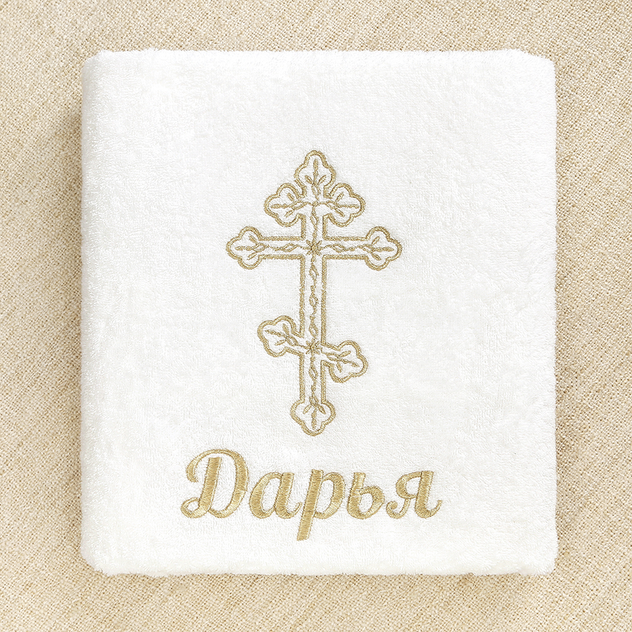 Есть варианты в чисто золотом и серебряном цвете (нить-металлик), как на примере с именами. Полотенце с металлизированной вышивкой будет дороже на 300 руб. Имя дополнительно + 250 руб. в цвете креста.