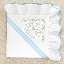 | Очень красивая крыжма для девочки в бело-голубом исполнении. Двухслойная пеленка: мягкий лен и хлопок + теплая фланель, которая также отлично впитывает воду. По периметру украшена рюшей с голубой окантовкой, уголок с вышивкой на подкладке. Подойдет к платью Незабудка. |