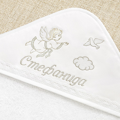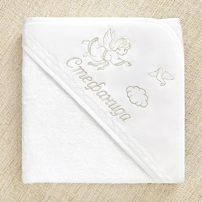 Махровое полотенце с капюшоном на крестины ребенка. Окантовка по всем срезам, капюшон с подкладкой. На нем изображен ангелочек с птичкой. Рисунок универсальный - можно приобрести как для мальчика, так и для девочки. Вышивка выполнена вискозными нитями в голубо-серо-серебряной гамме. Подходит к рубашке с одноименным названием.