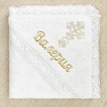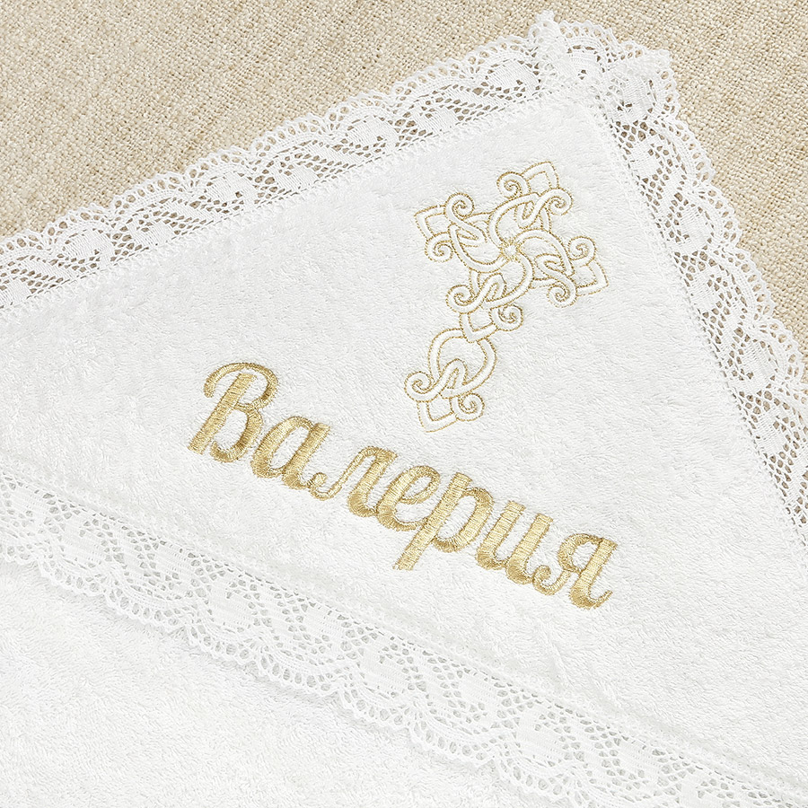 Очень красивое махровое полотенце на крестины малыша. По периметру украшено кружевом. На уголке вышит серебряными или золотыми нитями (на выбор) ажурный православный крест.