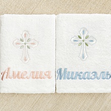 Вискозными нитями выполнена вышивка: голубой крестик для мальчика (подходит к рубашке Василек) или крестного, розовый - для девочки (к платью Серафима) или крестной.