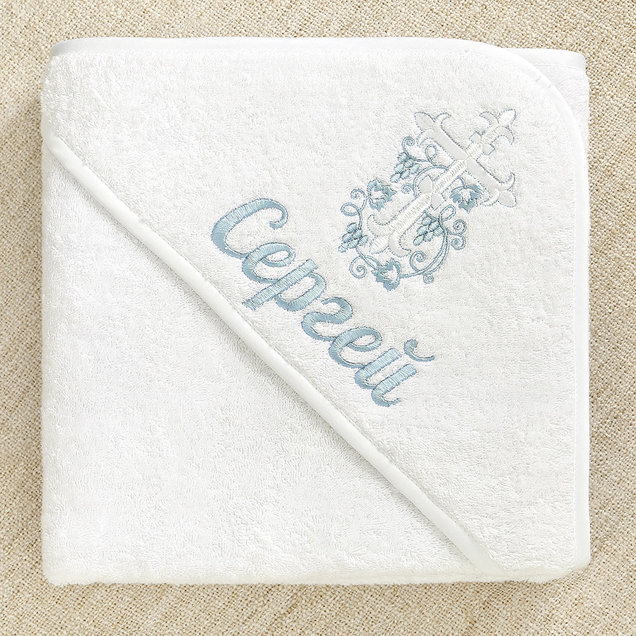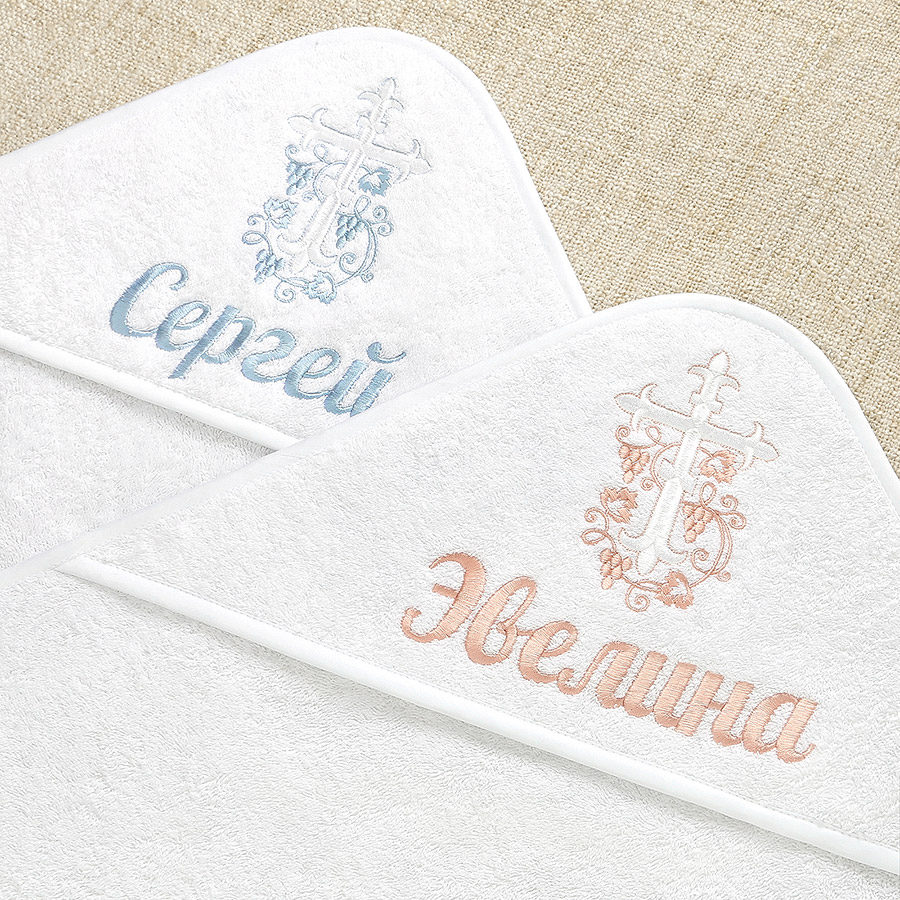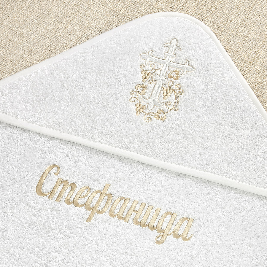 Махровое полотенце с уголком на крестины малыша. Окантовка по всем срезам, капюшон с подкладкой. На нем вышит православный крест с виноградной лозой.