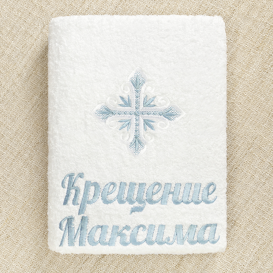 Пушистое крестильное полотенце с бордюром из 100% махры. На выбор два размера: 70х130 или 100х150. Вышивка: православный крест белого или голубого цвета с лучиками.