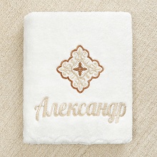 Махровое полотенце на крестины ребенка с бордюром и фабричным краем. На нем вышит достаточно крупный крест коричневого или зеленого цвета на выбор.