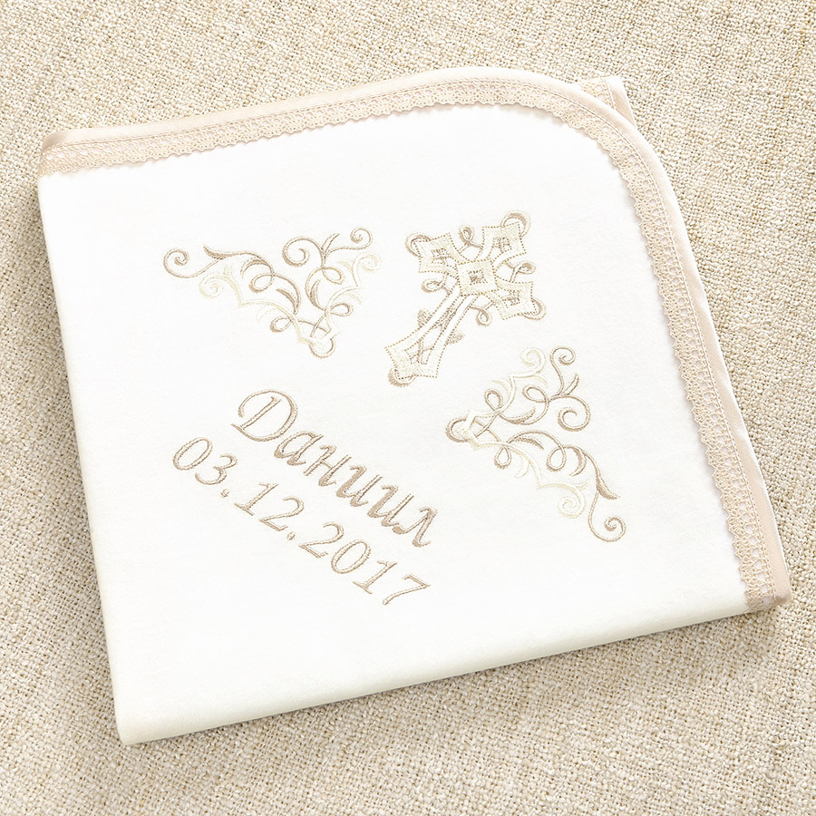 Мягкая пеленка для Крещения из фланели (100% хлопок). Материал отлично впитает влагу после купели. Украшена кружевом и атласной бейкой. В уголке вышит бежевый православный крест. Универсальная по цвету - подойдет и девочке, и мальчику. Такой же крест вышит на крестильной рубашке Никита.